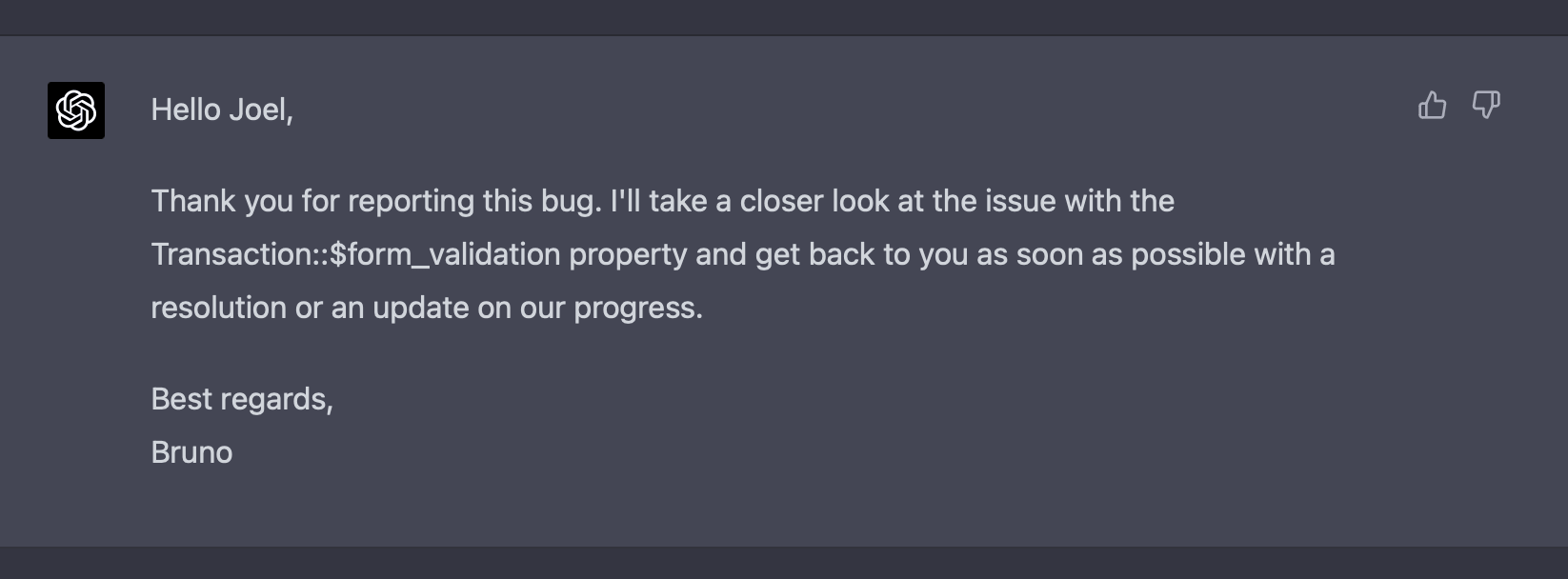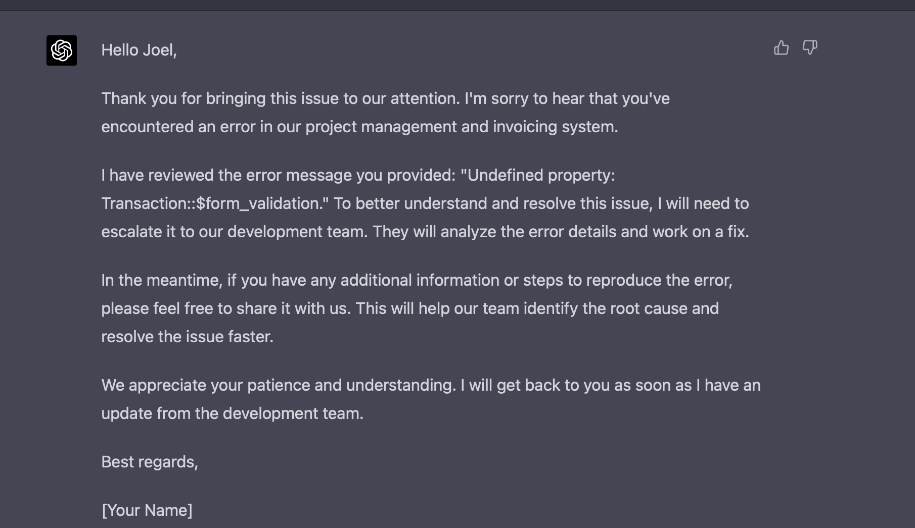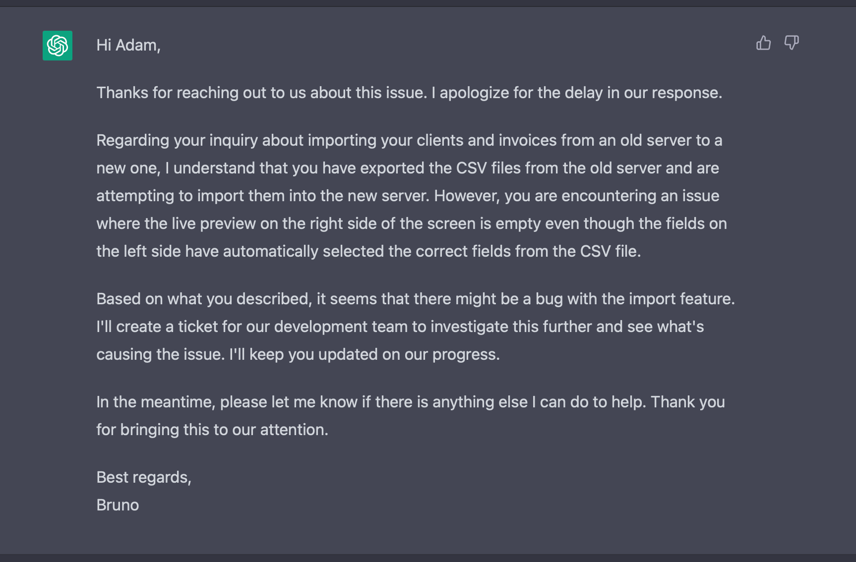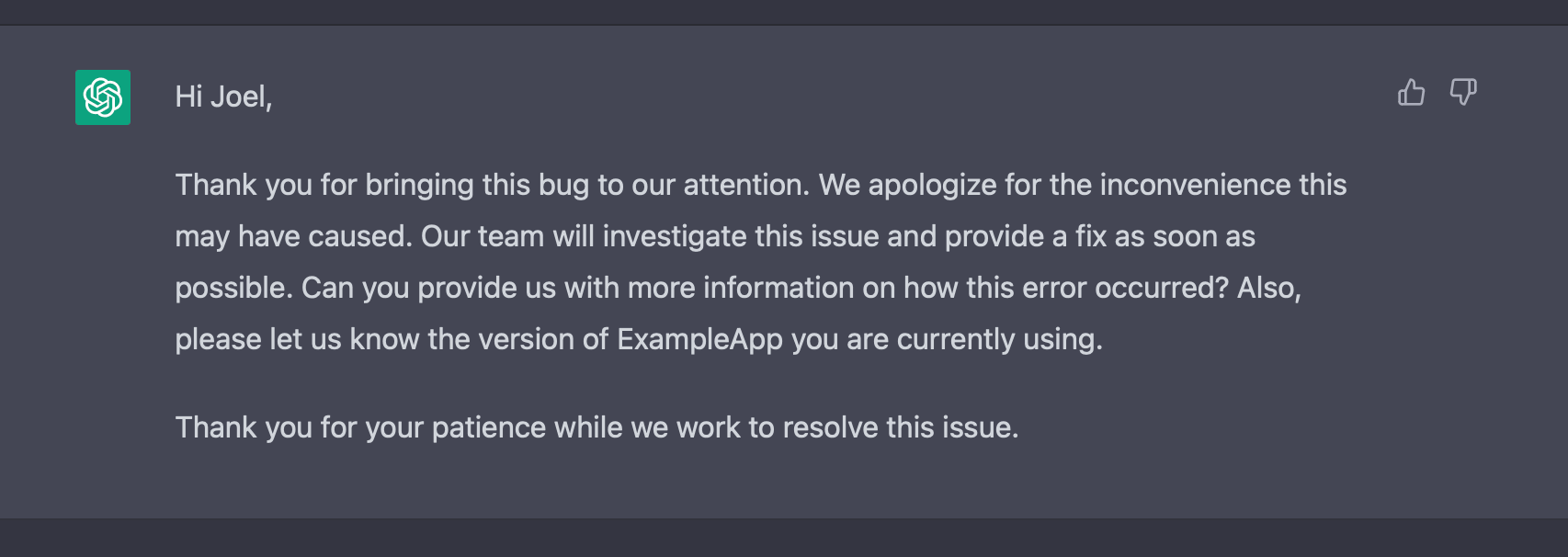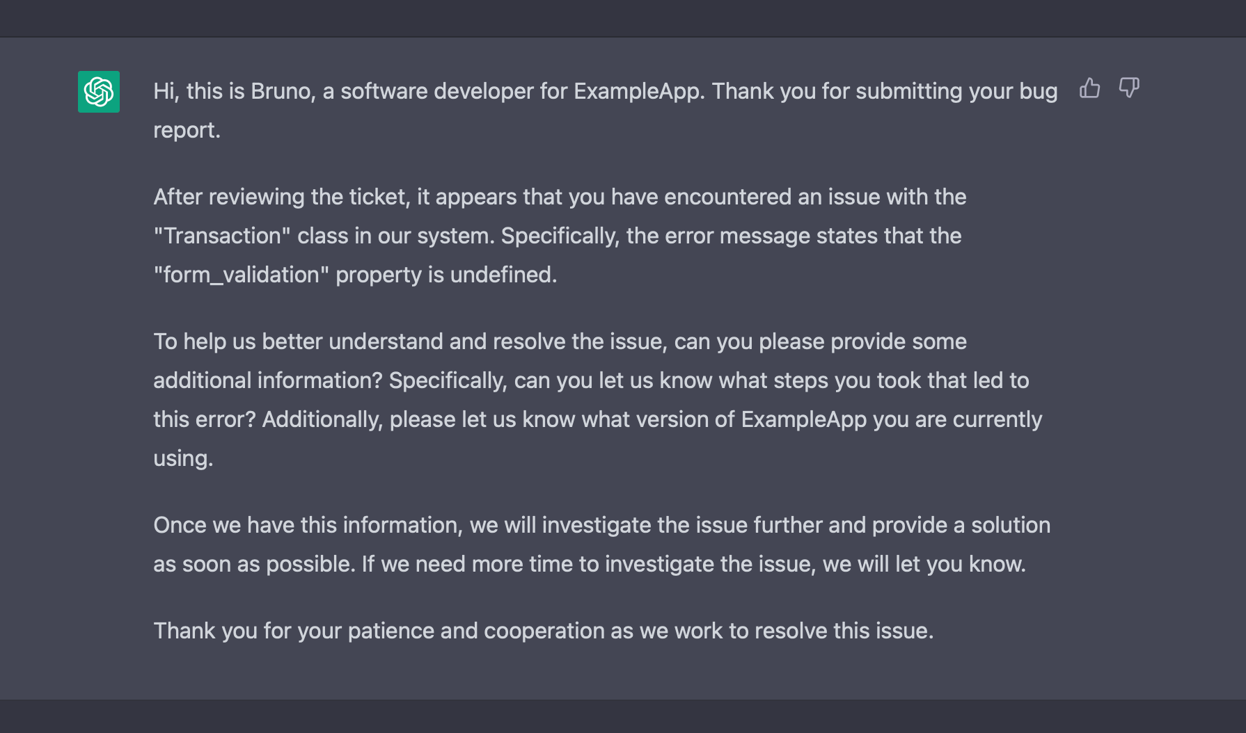 Let's set out to investigate if it's possible. I have a sample bug report for testing. I can start by giving ChatGPT (where I have access to GPT-4) a simple prompt, asking it to act as a customer support agent, and providing a few details about the system and our policies (e.g. if it's a bug, tell the customer you will escalate it to the development team, if it's a feature don't promise we're building it, etc.)