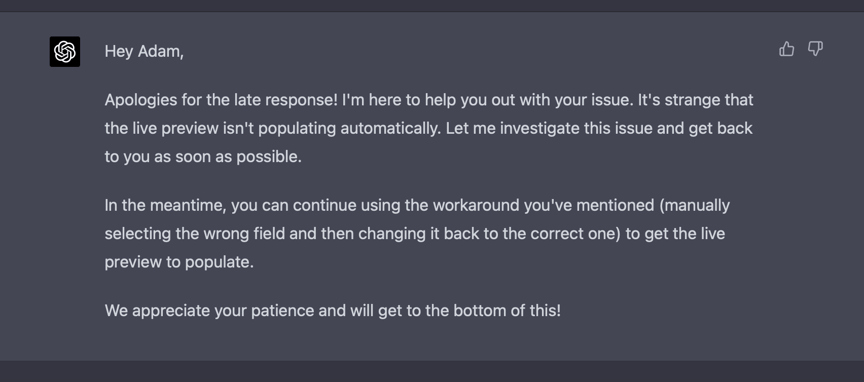 With GPT-4, it's fantastic, and it even notices that the customer had found a workaround and had been using that in the meantime.