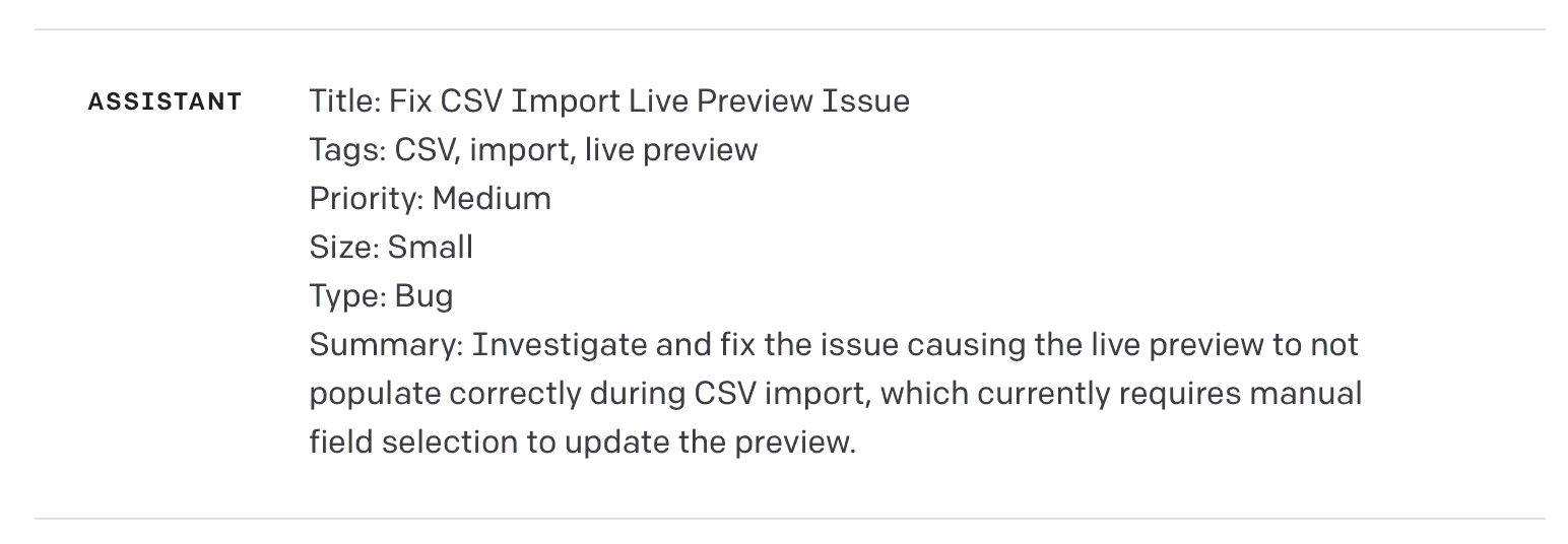 The answer is a second prompt. This second prompt receives the same ticket data, but instead of generating a response for the customer, it generates a GitHub issue.