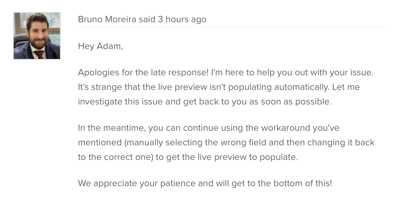But I don't like that it's introducing itself. The customer already knows it's Bruno. These conversations happen in our support ticket system; my name and picture are on the page! Let's try a few variations of the prompt until we nail it.